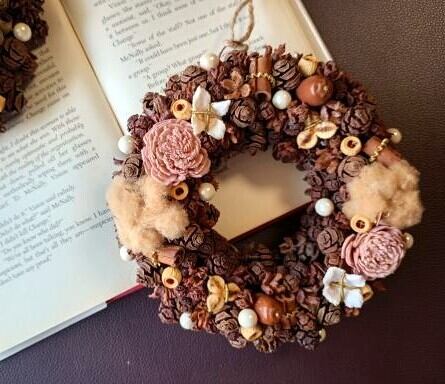 自然素材を活かした【木の実ぎっしりクランツ】は、独特のテクスチャーと豊かな風合いが魅力的なインテリアアイテム。綿の実やメタセコイヤの実、トベラの実などを加え、ナチュラルな商品に仕上げました。リビングや玄関のインテリアにぴったりです。ご自宅用にはもちろん、ギフトとしても喜ばれるアイテムです。