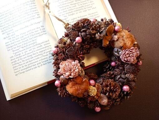 自然素材を活かした【木の実ぎっしりクランツ】は、独特のテクスチャーと豊かな風合いが魅力的なインテリアアイテム。綿の実やソラフラワー、どんぐりなど身近な木の実を用いてナチュラルな商品に仕上げました。ピンク色のピックが大人かわいい演出をしてくれます。ご自宅用にはもちろん、ギフトとしても喜ばれるアイテムです。