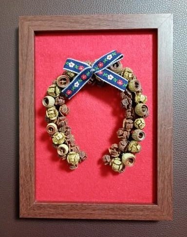 魔除けの象徴として知られる馬蹄をモチーフにしたフレーム飾りは、玄関やリビングなどに飾ることで、空間に温かみと安心感を与えます。小さなサイズながらもその存在感は抜群で、特に新築祝いなどのギフトにもお勧めできる逸品です!使用している木の実はひのき、ユーカリです。